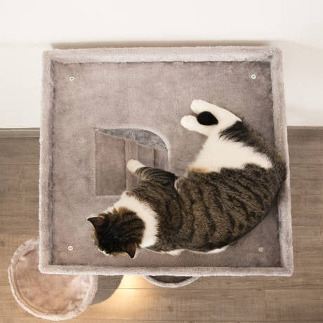 Elevate your feline's playtime and relaxation with our premium cat tree, designed with a stable base for enhanced safety and stability. The spacious, warm plush condo provides a serene retreat for your cat to nap undisturbed, while strategically placed dangling toys keep them engaged and entertained.