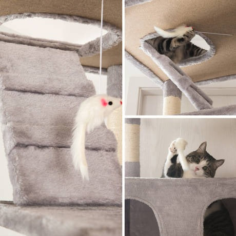 The sturdy hammock, securely attached to the posts, offers a cozy spot for your cat to lounge, ensuring they feel safe and comfortable. With a large soft platform for additional resting space and durable sisal-wrapped posts for scratching, this cat tree is crafted from high-quality natural particleboard and skin-friendly plush fabric, making it the perfect addition to your home. An anti-tipping strap adds extra security, allowing you to fix it to the wall for peace of mind.